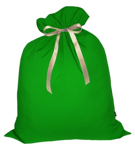 В такой огромный мешок поместится даже самый объемный подарок. Мешок сшит из хлопковой или синтетических тканей.